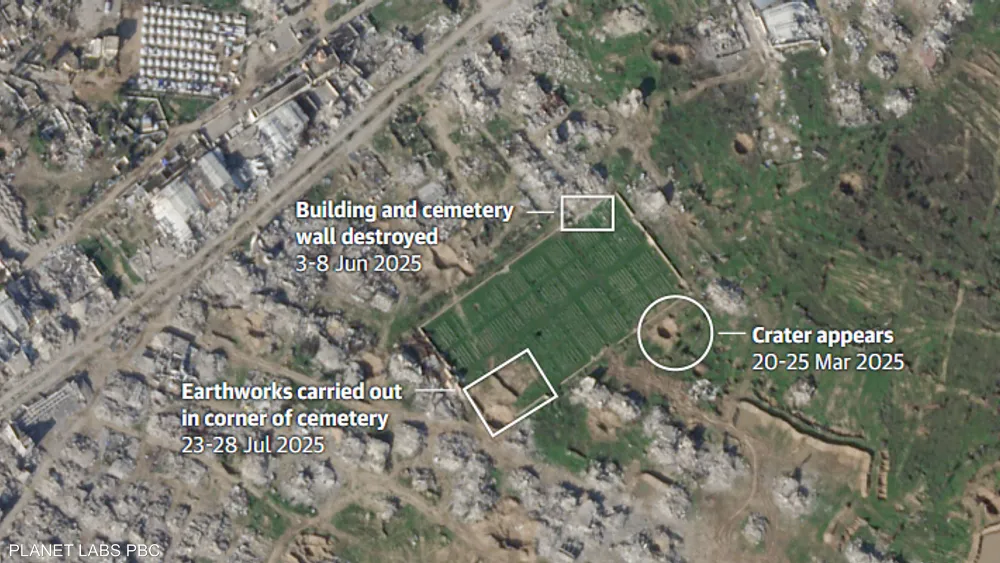 ووفق صحيفة “غارديان” البريطانية، تكشف الصور الملتقطة للمقبرة الواقعة في حي التفاح بمدينة غزة، عن عمليات حفر وتسوية واسعة النطاق في الزاوية الجنوبية الغربية للموقع.